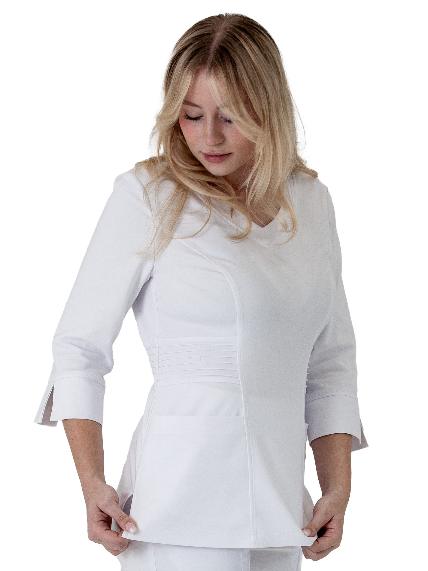 Elegant Roma medical Scrub Top from Apronèe! Comfortable, functional, and stylish. Features a V-neck, 3/4 sleeves, and subtle pleats. Made with Premium cotton fabric. Ideal for medical, cosmetic, and beauty professionals. Available in many colors and sizes.