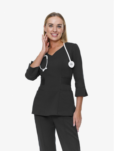 An elegant V-neckline adds dignity and class, while delicate cuffs and 3/4 sleeves introduce a fashionable touch that sets it apart from classic scrubs. This allows you to look professional and stylish without sacrificing comfort. The side vents are not just a stylistic element but, most importantly, a practical solution that provides freedom of movement, which is crucial in a dynamic work environment.