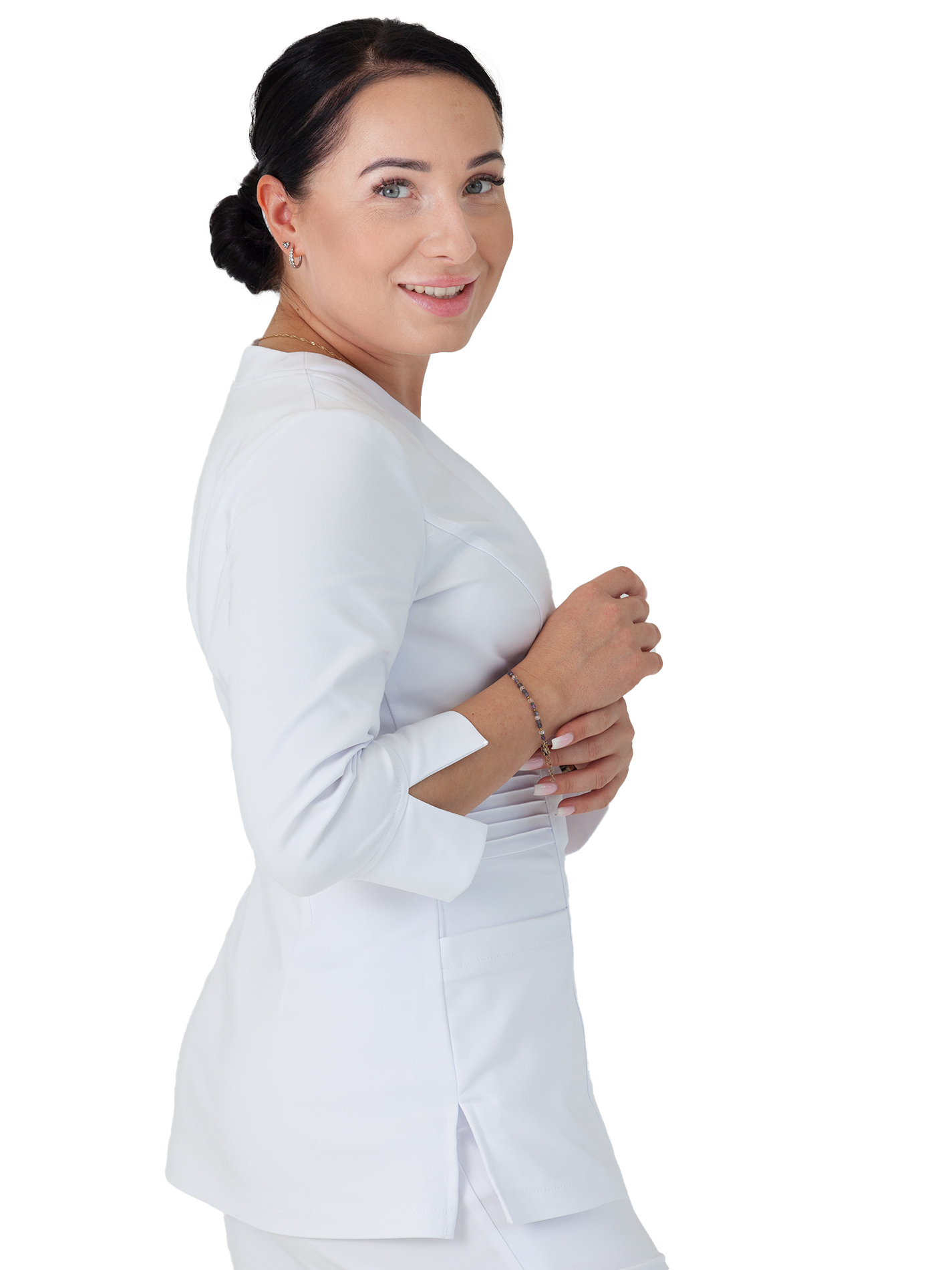 An elegant V-neckline adds dignity and class, while delicate cuffs and 3/4 sleeves introduce a fashionable touch that sets it apart from classic scrubs. This allows you to look professional and stylish without sacrificing comfort. The side vents are not just a stylistic element but, most importantly, a practical solution that provides freedom of movement, which is crucial in a dynamic work environment.