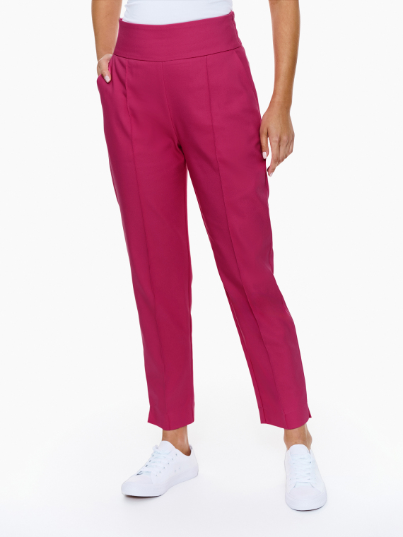 Lekko podniesiony stan, subtelnie przeszyta z tyłu guma oraz ukryty suwak zapewniają idealne dopasowanie do sylwetki i wygodę noszenia przez cały dzień.